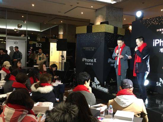 사전예약자 80명은 회사 측이 준비한 X자 표시 탁자에 앉아 도시락과 커피를 마시며 개통을 준비했다. SK텔레콤은 아이폰X가 곧 다가올 X-MAS를 연상시키는 만큼 ‘SK텔레콤에서 미리 만나는 X-MAS’라는 컨셉으로 진행했다. 참가자 전원에게 빨간 목도리를 선물로 증정하기도 했다.