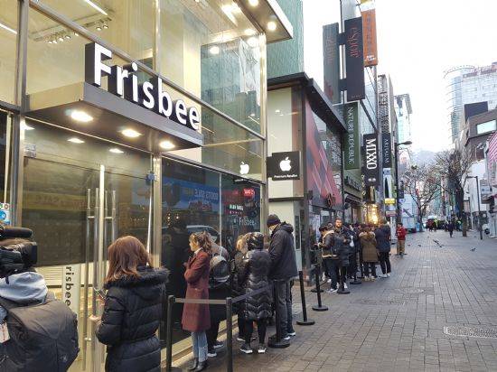 명동 프리스비는 애플이 신제품을 내놓을 때마다 소비자들이 항상 매장 외벽을 긴 줄로 둘러싸며 대기하는 곳으로 유명하다. 전날 자정 즈음부터 쏟아지기 시작한 눈발로 기온은 영하2도로 내려갔다. 그럼에도 불구하고 오전 8시까지 35명의 고객들이 입구에서 대기했다. 직원들 역시 대기 중인 소비자들에게 미리 준비한 핫팩을 나눠주는 등 분주한 모습이었다.