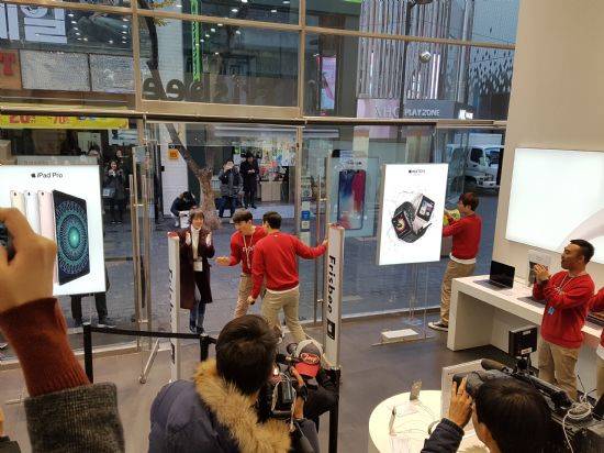 국내 아이폰 판매 메카라 할 수 있는 애플 리셀러숍 명동 프리스비도 같은 날 아이폰X 판매를 시작했다. 명동 프리스비는 이날 오전 8시에 문을 열고 20여 명 직원들의 환호성과 함께 첫 손님을 맞았다.