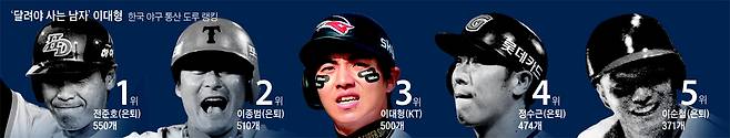 '수퍼소닉(supersonic·초음속)' 이대형(34·KT)은 18일 현재 프로 통산 500번째 도루를 기록 중이다. 지난 13일 삼성전에서 500개를 채웠다. 은퇴한 왕년의 대도(大盜) 전준호(550개), 이종범(510개)에 이어 KBO 역대 3위 기록이다. 올 시즌에도 18개로 리그 3위다. 이대형이 역대 1위에 오르는 건 시간문제라는 게 전문가들의 견해다. 18일 잠실 야구장에서 만난 이대형은 "베이스를 훔칠 때마다 가졌던 긴장감이 지금의 나를 만들었다. 건강한 몸을 주신 부모님께 감사하다"고 말했다.