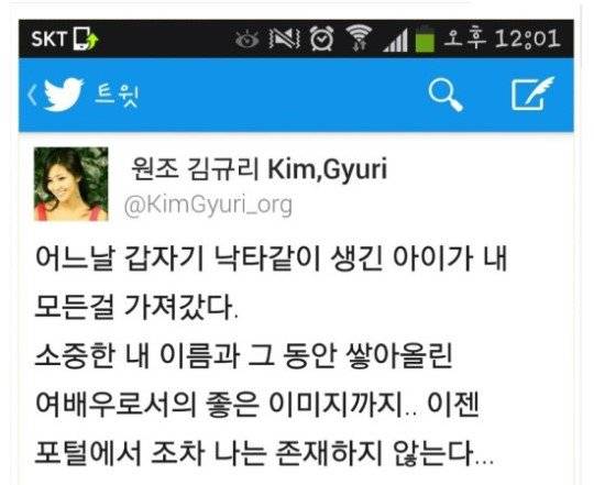 '원조 김규리'로 계정 이름이 표시돼 있었고, 캡처 화면에는 "낙타같이 생긴 아이가 내 모든 걸 가져갔다. 소중한 내 이름과 그동안 쌓아올린 여배우로서의 좋은 이미지까지"라는 글이 적혔다.