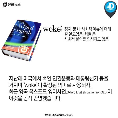 지난해 미국에서 흑인 인권운동과 대통령선거 등을 거치며 ‘woke’이 확장된 의미로 사용되자, 최근 영국 옥스포드 영어사전(Oxford English Dictionary·OED)이 이것을 공식 반영했습니다.