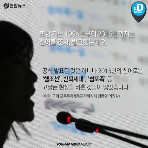 또한 지난 1994년부터 2015년까지는 신어를 조사, 발표했는데요. 공식 발표된 것은 아니나 2015년의 신어로는 '헬조선', '반퇴세대', '쉼포족' 등 고달픈 현실을 비춘 것들이 많았습니다. (출처: 국회 교육문화체육관광위원회 염동열 의원실)