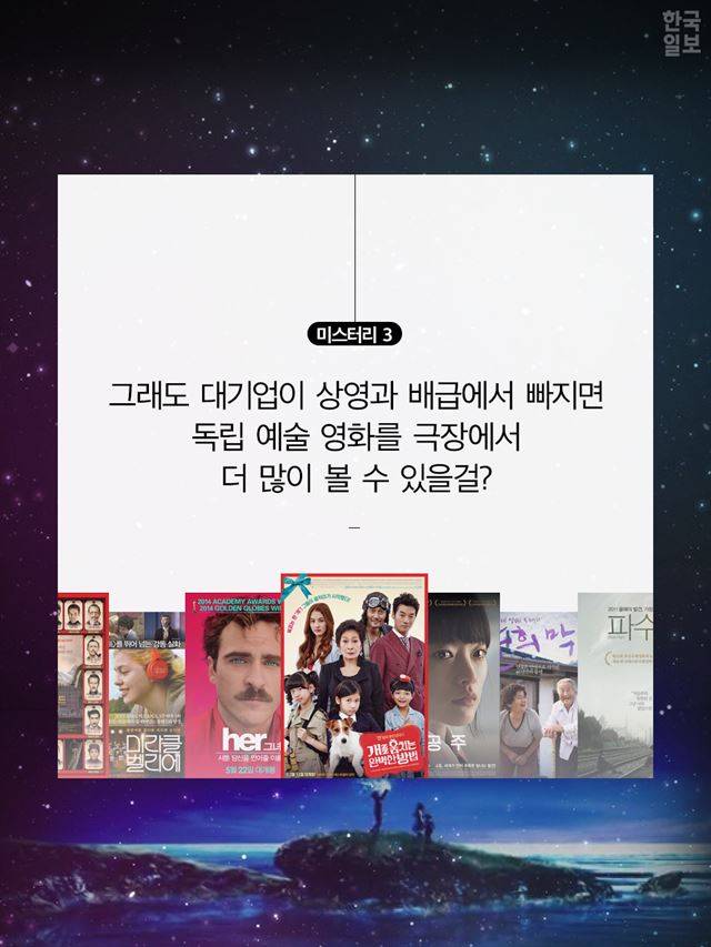 그래도 대기업이 상영과 배급에서 빠지면 독립 예술 영화를 극장에서 더 많이 볼 수 있을걸?