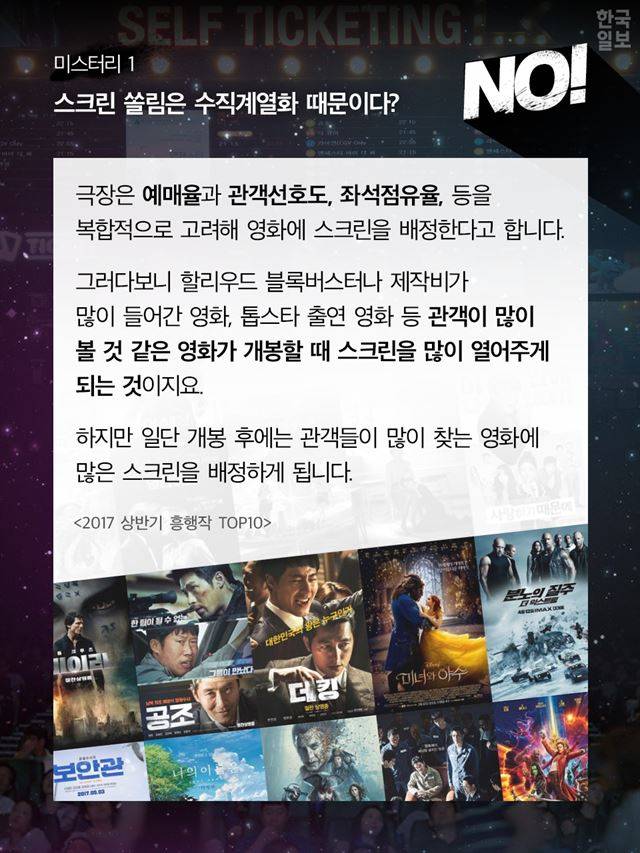 그러다보니 할리우드 블록버스터나 제작비가 많이 들어간 영화, 톱스타 출연 영화 등 관객이 많이 볼 것 같은 영화가 개봉할 때 스크린을 많이 열어주게 되는 것이지요.