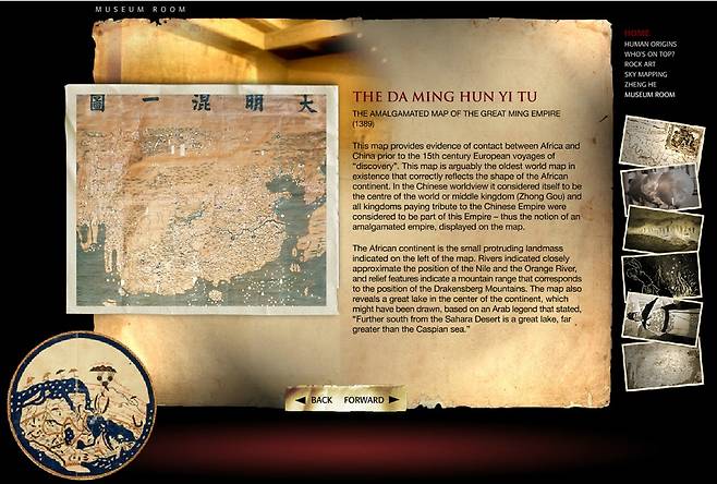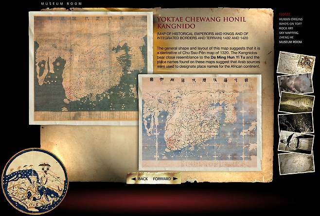 2002년 11월 남아공 국회의사당에 전시된 강리도를 지금은 사이버 박물관 전시실에서 만나볼 수 있습니다. 먼저 대명혼일도를 봅니다. 제작 시기와 제작자가 불명인 이 대형 지도(386cmx456cm)의 세계상은 강리도와 대체로 일치합니다. 다만 좌우 양측이 불완전하게 잘려나간 인상입니다.