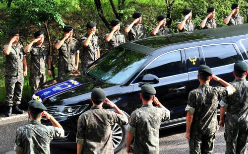 K-9 자주포 사격훈련 중 폭발 사고로 숨진 고(故) 이태균(26) 상사와 정수연(22) 상병의 영결식이 21일 오전 7시 30분 경기 성남 국군수도병원에서 열렸다.