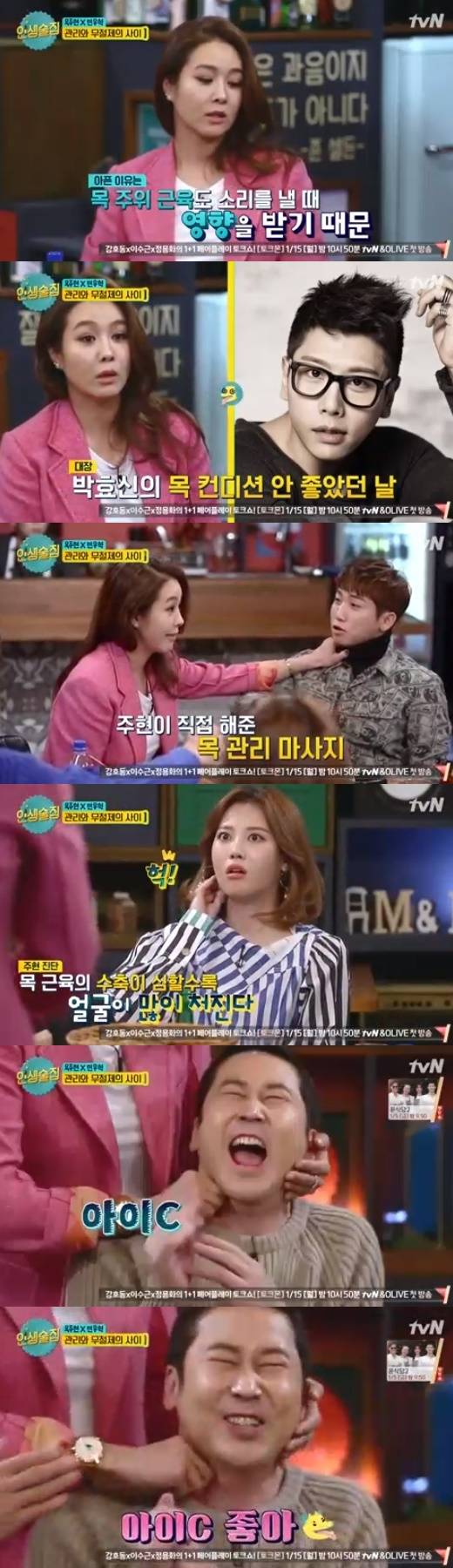 특히 옥주현은 "노래를 많이 하면 목 주위 근육이 아프다. 소리를 낼 때 목 근육이 많이 쓰이기 때문이다"라며 "박효신 씨가 목 컨디션이 안 좋았던 날이 있다. 그래서 목 관리 마사지를 해줬다. 처음에는 비명을 질렀지만 나중에는 자기가 알아서 하더라. 목 근육의 수축이 심할수록 얼굴이 빨리 쳐진다. 목 근육이 수축하지 않게 해주는 거다"라고 출연진들에 목 마사지를 전수했다.