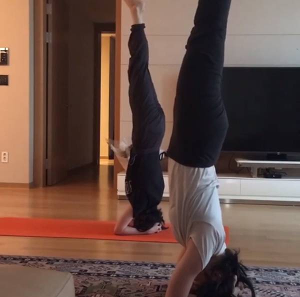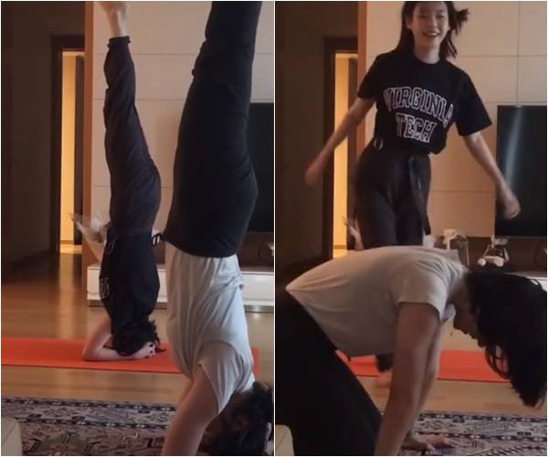 가수 아이유가 고난도 요가 동작에 성공했다.