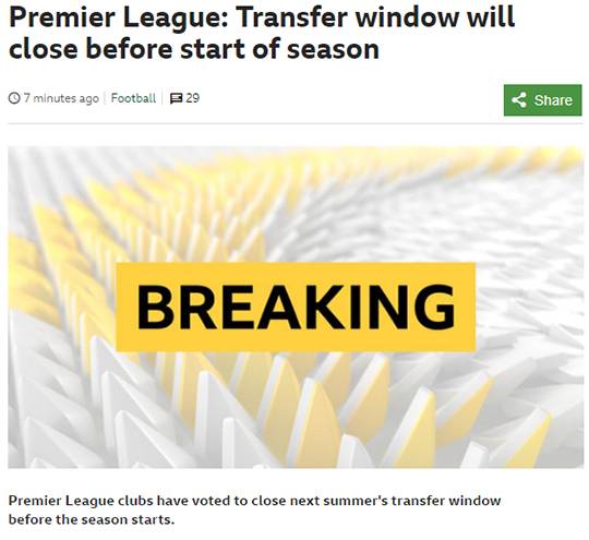 결국 EPL 구단들의 투표 결과, 이적 시장 조기 마감이 통과됐고 다음 시즌부터 적용된다.