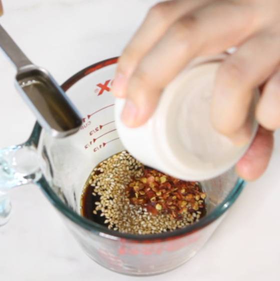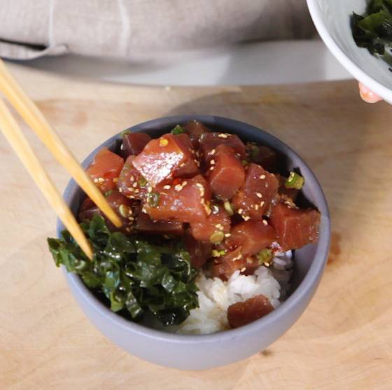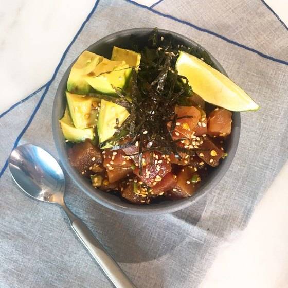 참치회 200g, 아보카도 1/2개, 쌀밥 혹은 현미밥 1인분, 간장 2큰술, 식초 1작은술, 참기름 1작은술, 참깨 1작은 술, 설탕 1작은술, 레드페퍼 플레이크 1/2 작은술, 쪽파 1~2줄, (옵션) 데친 미역, 생강 피클, 김