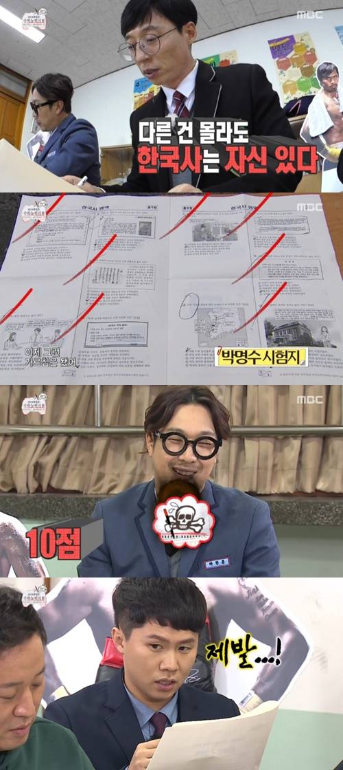 4교시 박명수의 한국사영역. 5인방 중 한국사 공부에 올인했던 유재석은 문제를 척척 풀어내 멤버들을 감탄하게 했다. 정준하는 인터넷 강의에서 본 지식을 뽐냈다. 반면 박명수는 시험 종료 시간을 10분이나 남겨둔 상황에서 정답체크를 끝내 모두를 놀라게 했다.