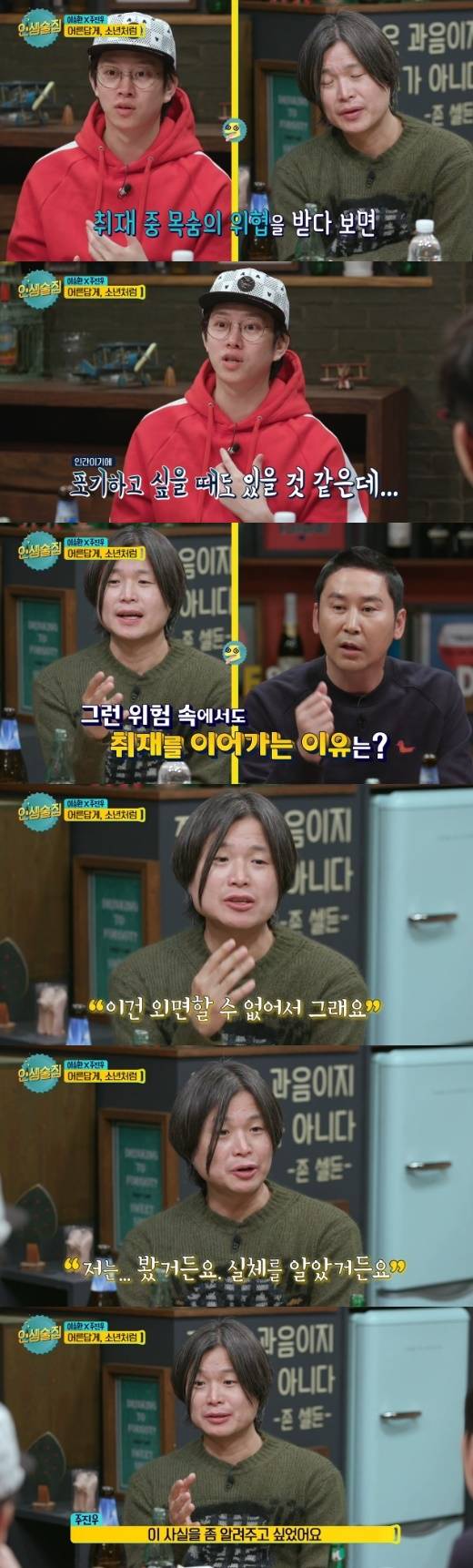 이에 김희철은 주진우에 "취재 중 목숨의 위협을 받다 보면 인간적으로 무섭지 않냐. 포기하고 싶을 때도 있을 거 같은데"라고 물었고, 주진우는 "외면할 수 없어서 그렇다. 젊고, 아직 정치를 모른다고 복지를 뺏어가고 시간을 뺏어가고 억압하고 있다. 잘못된 것을 잘못됐다고 말하는 게 내 일이다. 깡패들이 괴롭히는 걸 보고 외면할 수 없어 계속 외치고 있는 거다"라고 답했다.