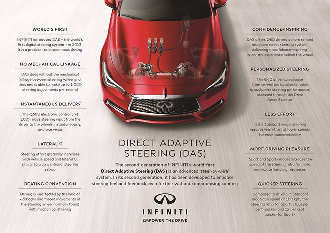 일본의 EPS 전문 부품 제조회사인 제이텍트는 레벨 4또는 5의 자율주행이 구현되려면 스티어 바이 와이어가 필수적이라고 보고 있다. 인피니티 Q50S에 적용된 ‘다이렉트 어댑티브 스티어링’이 기존의 EPS에서 ‘스티어 바이 와이어’로 진화하는 중간 과정이라고 할 만 하다. 물론 이 시스템도 모든 시스템이 고장날 경우를 대비하여 피니언과 랙을 연결하는 기계적인 백업 시스템을 갖추고 있지만 말이다.
