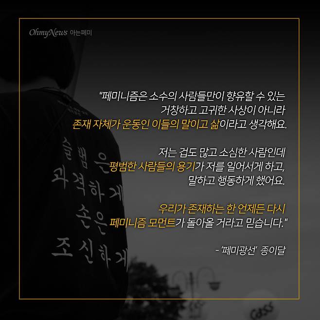 종이별: "페미니즘은 소수의 사람들만이 향유할 수 있는 거창하고 고귀한 사상이 아니라 존재 자체가 운동인 이들의 말이고 삶이라고 생각해요. 저는 겁도 많고 소심한 사람인데 평범한 사람들의 용기가 저를 일어서게 하고, 말하고 행동하게 했어요. 어떤 정해진 순간은 없더라도 우리가 존재하는 한 언제든 다시 페미니즘 모먼트가 돌아올 거라고 믿습니다."