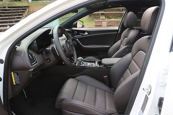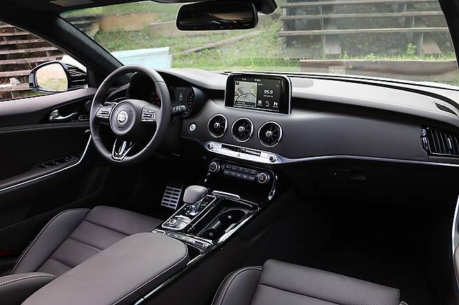 3 스포크 스티어링 휠은 스포티함을 강조하는 타입으로 엄지손가락을 올리는 부분이 두툼하게 다듬어져 있다. 3.3L GT 모델에만 D컷 스티어링 휠이 적용되는 것은 약간 아쉽지만 이 정도로도 GT의 분위기는 살릴 수 있다. 시트는 5인승을 표방하고 있지마 실질적으로는 4인승인데, 1열 시트의 경우 버킷 스타일의 나파 가죽 시트를 적용하면서 착좌감이 단단하면서도 몸에 피로나 스트레스가 느껴지지 않도록 다듬어졌다. 그동안 국산차에서 푹신함이 강조되었다는 것을 고려해 보면 변화가 제법 크다.