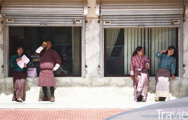 열에 아홉은 전통복장을 입고 있으니, 차라리 민속촌이라 했더라면 팀푸의 풍경이 더 쉽게 이해됐을지 모른다. 무릎까지 오는 통 넓은 겉옷을 입고 허리춤을 고정한 남자의 전통 옷 고(Gho), 원통형 치마와 앞섶이 투박한 웃옷을 같이 입는 여자의 전통 옷 키라(Kira). 톤 낮은 묵직한 색의 전통복장은 시내의 풍경에 이질감 없이 녹아 들었다. 색 바랜 오래된 전통 건물 사이에 있으니, 사실 이상할 것도 없었다. 이질감은 엉뚱한 데서 발견된다. 신발이다. 남자들은 앞코가 뾰족한 갈색 가죽구두를 반짝반짝 닦아서 신고, 여자들도 긴 치마 밑으로 굽 높은 뾰족구두를 신고 다닌다. 이 동네의 멋쟁이를 가리려면 구두부터 살펴보시라.
