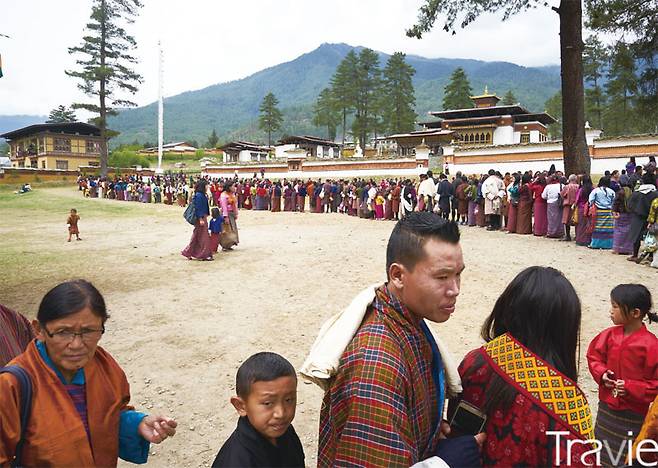 넓은 사원 마당을 넘어 입구를 한참 지난 지점까지 줄이 길게 이어져 있다. 굽어진 것까지 감안하면 족히 수 킬로미터는 되지 않을까. 길가에는 과자와 곡식을 묶음으로 파는 상인들이 쪼르륵 앉았다. 시장이라도 선 듯 북적북적한 분위기는 빵리잠빠(Pangri Zampa) 축제 때문이다. 매년 4월에 5일 동안 열리는 축제로 팀푸에서 약 2시간 거리에 자리한 빵리잠빠 사원에서 열린다. 샵뚱 나왕 남갤이 부탄으로 가는 길목에 머물렀다 하여 부탄 사람들에게 큰 의미를 지니는 사원이다. 사원 앞뜰에는 샵뚱의 나무 지팡이가 자랐다는 거대한 나무가 하늘 높이 솟아 있다.