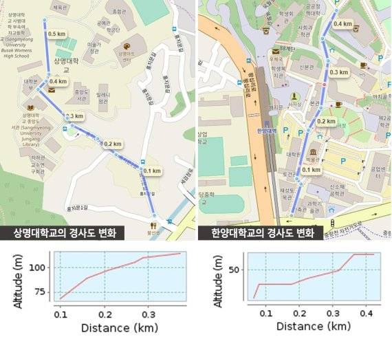| ▲상명대학교와 한양대학교의 경사도 변화 모습/사진=GPSies.com |