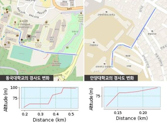 | ▲동국대학교와 앙양대학교의 경사도 변화 모습/사진=GPSies.com |
