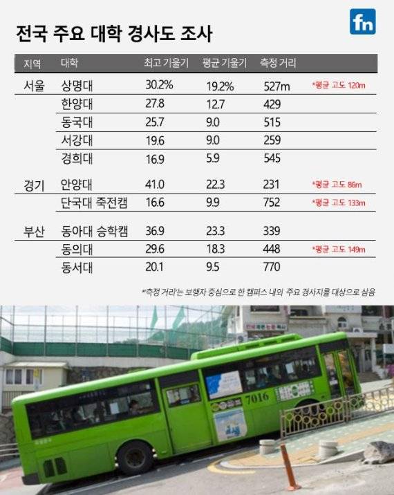 <파이낸셜뉴스>는 악명 높은 언덕길을 가진 대학 캠퍼스 10곳을 대상으로 ‘구글어스’를 통해 산정 거리에 따른 경사도를 측정해 보았다. 선정된 10곳은 최근 온라인상에서 ‘누가 가장 힘들었나’ 입씨름을 벌인 네티즌들이 추천한 학교를 대상 삼았다. 측정 거리는 보행자 중심으로 한 캠퍼스 내외 주요 경사지를 측정했다.