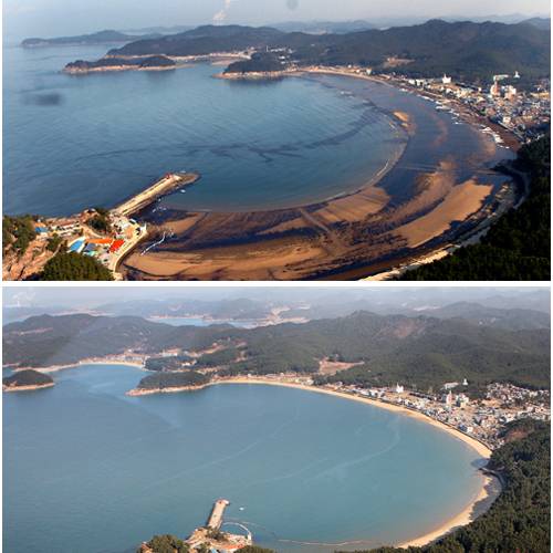 | 2007년 12월7일 충남 태안군 만리포해수욕장 앞바다에서 대형유조선 허베이 스피리트호와 삼성중공업 해상 크레인이 충돌했다. 이 사고로 기름 1만2547㎘가 태안 앞바다로 유출됐다. 사고 당시 만리포해수욕장(사진 위)과 복구 후 만리포해수욕장 모습. 충남도 제공 |