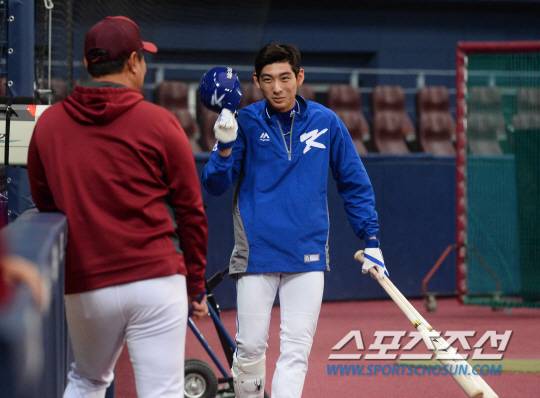 '아시아 프로야구 챔피언십(APBC) 2017' 국가대표팀과 넥센 히어로즈의 연습경기가 10일 서울 고척 스카이돔에서 열린다. 경기전, 대표팀 이정후가 넥센 심재학 코치에게 인사를 하고 있다.