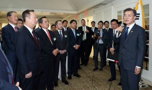 | 청와대는 문재인 대통령이 오는 27일과 28일 기업인들과의 대화 시간을 가진다고 밝혔다. 사진은 지난달 말 문 대통령이 미국 워싱턴을 방문했을 때 수행한 경제인들과 차담회를 하는 모습. |