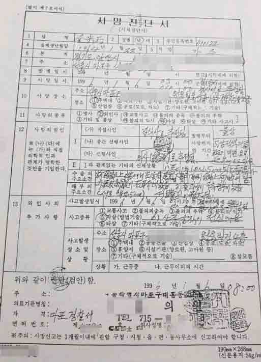 故 김광석의 처 서해순씨가 남편의 사망진단서를 최초 공개했다.