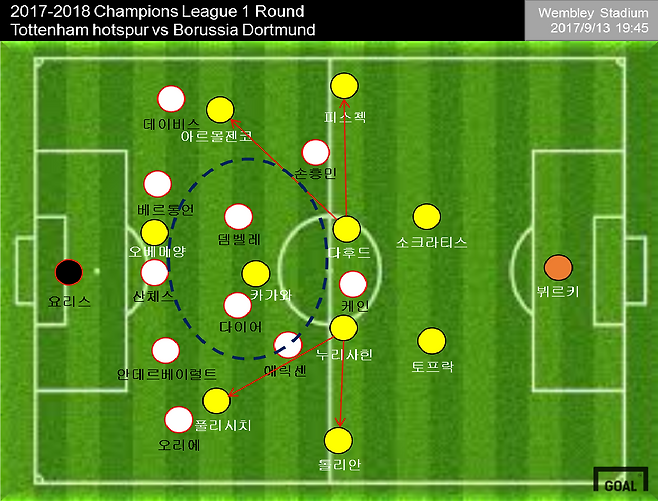 토트넘은 5명의 수비수를 촘촘히 세웠고, 평소와 다르게 in possession(공격 상황)에서도 양쪽 풀백들이 전혀 공격에 가담하지 않은채 수비에 집중했다. 수비라인 앞선의 뎀벨레와 다이어 역시 평소와 다르게 공격에 관여를 자제했고, 상대의 페널티에어리어 접근을 막는데 초점을 뒀다. 실제로 이날 도르트문트는 시종일관 볼을 돌리며 경기를 지배했고, 평소보다 많은 수치인 888번의 터치수를 기록했지만, 페널티 박스 안에서 공을 터치한 횟수는 단 19회 뿐이었다. 이날 도르트문트는 68%의 점유율 속에서도 토트넘보다 적은 슈팅수(토트넘:13 도르트문트:10)와 유효슈팅수(토트넘:12 도르트문트:5)를 기록했고, 페널티 에어리어 안에서의 슈팅수는 단 5개(토트넘 12개) 뿐이었다.