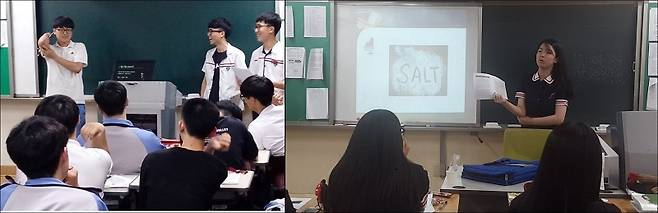 | ▲ 융합수업 한문-영어 융합수업과 화학-미적 융합수업이에요. 선생님들은 어디 가시고 학생들이 수업을 진행하고 있네요. |