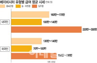 베이비시터 및 가사도우미 구인구직사이트 ‘시터넷’에 따르면 서울 지역 기준 출퇴근 베이비시터 급여는 한국인이 월 평균 160만~170만원, 중국인 동포 등 외국인이 130만~140만원이다. 어린이집 등·하원만 돕는 베이비시터들은 한국인이 월 평균 100~140만원, 외국인이 70만~100만원이다.
