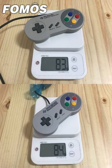 (위)기존에 출시된 컨트롤러와 (아래)미니 슈퍼패미컴 컨트롤러의 무게 비교. 큰 차이없다.