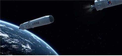 | 한국형 발사체가 1단 로켓과 추진제 탱크를 분리하는 상상도. |