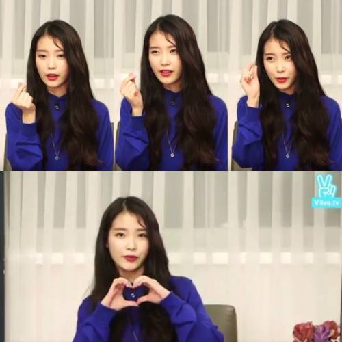 | (위)아이유가 "손가락 하트가 약오르는 모양인 것 같아서 예쁘지 않다"고 말하고 있는 모습. (아래)아이유가 "사진을 찍었을 때 예쁘게 나온다"고 말한 하트 모양.사진=V LIVE 캡처 |