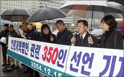 [오마이뉴스 박상규 기자] ▲ `언론개혁법안 관련 350인 선언` 기자회견이 15일 오후 서울 여의도 국회앞에서 열렸다. ⓒ2004 오마이뉴스 권우성 열린우리당과 한나라당이 언론사 소유지분 분산 조항을 제외한 언론관계법 개정안을 국회에 제출한 것과 관련, 언론・시민사회단체, 학계, 종교계 등 352명의 인사가 "소유지분 제한 없는 언론개혁법은 기만"이라며 반발하고 나섰다.