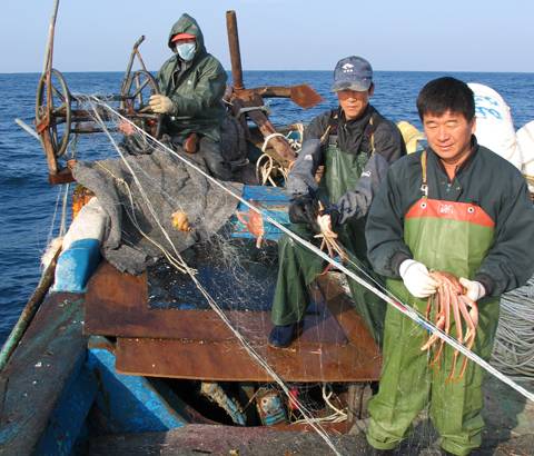 그물 첫 머리에는 상품가치가 없는 다리 잘린 대게와 주먹 만한 소라 등이 나온다. 선원들은 간간이 나오는 9㎝ 이하 치어들을 바다에 놓아준다. 5분 정도 끌어올리자 본격적으로 대게가 나온다. 능숙한 솜씨로 대게를 추려내 수조에 담는 선원들. 2시간여의 조업을 마치고 명성호는 또 다른 부표를 찾아간다.