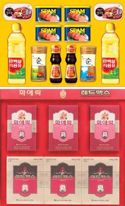 ◆CJ㈜=웰빙 트렌드에 맞춘 건강식품 중심으로 설 명절 선물세트를 구성했다. 출시 제품은 식품 모둠세트 5종과 참기름 9종, 식용유 12종, 올리브・해바라기유・홍화유・로프리 등 고급유 8종, 올리브유 스팸 6종, 스팸 9종, 참치 7종 등이다.