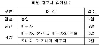 본인 및 배우자의 (외)조부모와 (외)증조부모, 형제자매와 그의 배우자, 부모의 형제자매와 그의 배우자 사망시 3~5일씩 주어지던 휴가는 모두 없어진다.