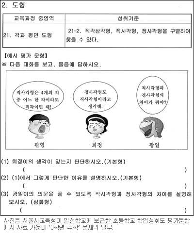 “정사각형도 직사각형인가. 왜 그런지 이유를 설명하라. 직사각형과 정사각형의 차이를 설명하라.”(초등 3학년 수학) “서로 다른 두 악기를 같은 시간 동안 연주해 나는 소리의 파형이다. 더 큰 소리로 연주하는 악기는 무엇이며 그 이유는 무엇인가. 두 악기가 서로 다른 악기라고 생각하는 이유는 무엇인가.”(중학 1학년 과학) “다음 글에 나오는 경제현상은 무엇이며, 발생원인과 이 현상의 발생 이후 등장한 자본주의 경제체제의 특징을 100자 내외로 서술하시오.”(고교 1학년 사회) 서울시교육청(교육감 공정택)은 최근 이같은 내용의 초등학교 학업성취도 평가 개선을 위한 교사용 예시 문항 자료와 중・고교 교사용 서술형・논술형 평가 예시 문항 자료를 개발, 일선 학교에 나눠줬다. 초・중・고교 예시문항은 경향신문 미디어칸(www.khan.co.kr)에서도 볼 수 있다.