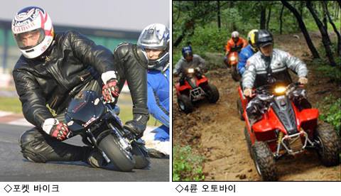 ◆포켓 바이크=오토바이의 스피드를 즐기고 싶지만 수백만원을 호가하는 가격과 사고 위험성 때문에 망설였다면 포켓 바이크로 눈을 돌려보자. 포켓 바이크는 이탈리아의 미니 바이크를 일본에서 더욱 작게 만든 것이다. 포켓 바이크는 높이가 50cm에 불과해 타고 있는 것을 보면 귀엽다는 생각이 들 정도다.