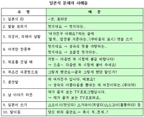 이처럼 일본식 문체가 인터넷을 점령하자 이를 지적하는 네티즌들의 목소리도 커지고 있다. 다음은 일부 우리 네티즌들이 의식 없이 주로 사용하는 일본식 글쓰는 법들.
