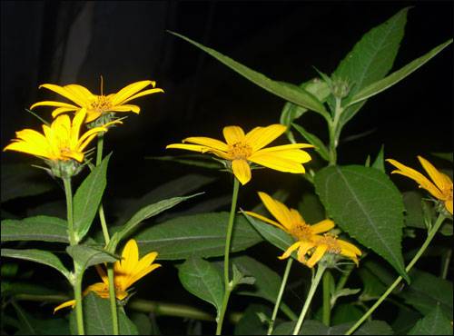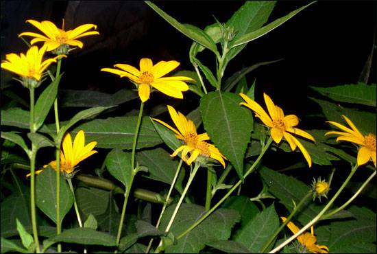 | ▲ 잎에 까만 먼지를 쓰고서도 잘자라 꽃을 피운 돼지감자꽃.2005년 10월 10일 통일로에서 |