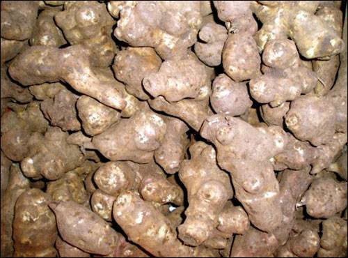감자가 예쁘게 생긴 작물은 아니지만, 이 돼지감자는 감자보다 더 울퉁불퉁하고 언뜻 보면 생강 같은 것이 그 형태를 종잡을 수 없습니다. 그야말로 엉뚱한 것이 '뚱딴지'라는 이름이 이래서 붙지 않았나 싶습니다. 아니면, 일반감자에 비해 더 못생겨 지어진 이름일지도.