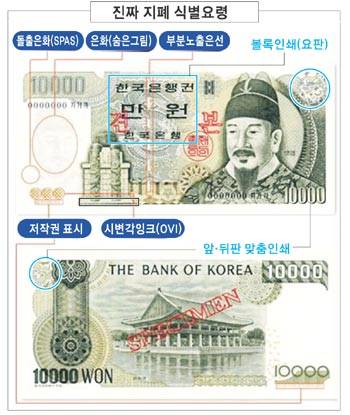 30일 한국은행에 따르면 진짜 지폐는 밝은 빛에 비춰보면 왼쪽 하얀 부분에 숨은 그림이 나타나지만 위조 지폐는 숨은그림이 없거나 숨은 그림이 있더라도 차이가 난다. 또 진짜 지폐는 점선 형태의 선명한 은색선이 있지만 위조 지폐의 경우 이 부분이 검은 색으로 나타난다. 은색 물감 등으로 덧칠하거나 은박지를 붙인 흔적이 있는 경우도 가짜다. 은선이 들어 있는 5000원권을 밝은 빛에 비춰보면 오른쪽에 2개의 숨은 막대가 나타난다. 은선이 없는 5000원권의 경우 진폐에는 숨은 그림의 인물 형태가 이이(율곡)의 도안 초상과 다소 다르지만 위폐에서는 도안 초상이 숨은 그림과 똑같다. 이와 함께 진폐는 문자,숫자 및 점자 부위가 볼록하게 인쇄돼 이 부위를 손으로 만져보면 오톨도톨한 감을 느낄 수 있지만 위폐는 점자 부분에 볼록한 느낌이 없다. 이는 최근 발견되는 위조 지폐의 대부분이 컴퓨터에 연결된 컬러프린터로 제작된 것으로 표면이 매끄럽기 때문이다.