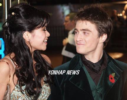 6일 영국 런던 레스터광장에서 열린 영화 "해리포터와 불의 잔" 시사회장에 도착한 영화배우 다니엘 래드클리프와 케이티 렁이 미소짓고 있다.