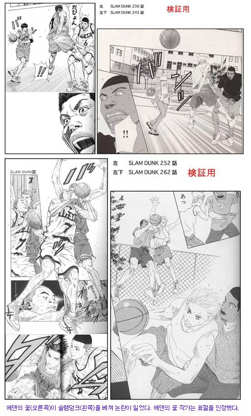 심지어 일본 네티즌들은 실제 NBA 경기사진과 슬램덩크 속 장면을 겹쳐놓는 등 수십장의 관련 사진을 게재하며 이노우에 다케히코를 공격하고 있다. 즉,슬램덩크도 표절작품이므로 슬램덩크를 표절한 에덴의 꽃만 비난할 수는 없다는 주장이다.