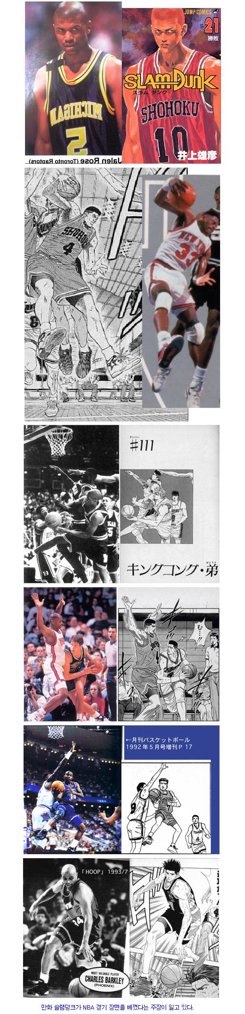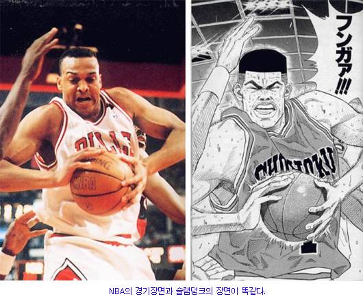 이들이 내세운 자료에 따르면 슬램덩크 속 유명한 장면들은 모두 NBA의 스틸 사진을 그대로 베꼈다. 강백호가 등장한 표지사진은 토론토 랩터스의 가드 제일런 로즈와 똑같고,채치수는 NBA 사상 위대한 선수 50인에 선정된 '킹콩 전사' 패트릭 유잉과 흡사한 사진도 있다.