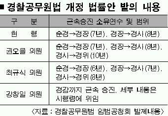 권 의원은 현행 제도에 경사로 10년 근무하면 경위로 자동 승진토록 한 반면, 최 의원은 경장과 경사 근속승진은 1년씩 줄이고 경사에서 8년이 지나면 경위로 승진하는 것을 추가했다. 반면 강 의원은 한발 더 나아가 경감까지 근속승진을 하도록 한다는 방안을 제시했다.( 표 참조)