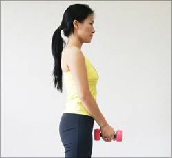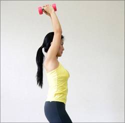 이 상태에서 아령을 든 팔을 서서히 뒤로 올려준다. 다시 천천히 내려 원자세로 돌아온다. 10~15회 반복한다. 이어 팔과 다리를 바꿔 같은 방법, 같은 회수로 실시한다.